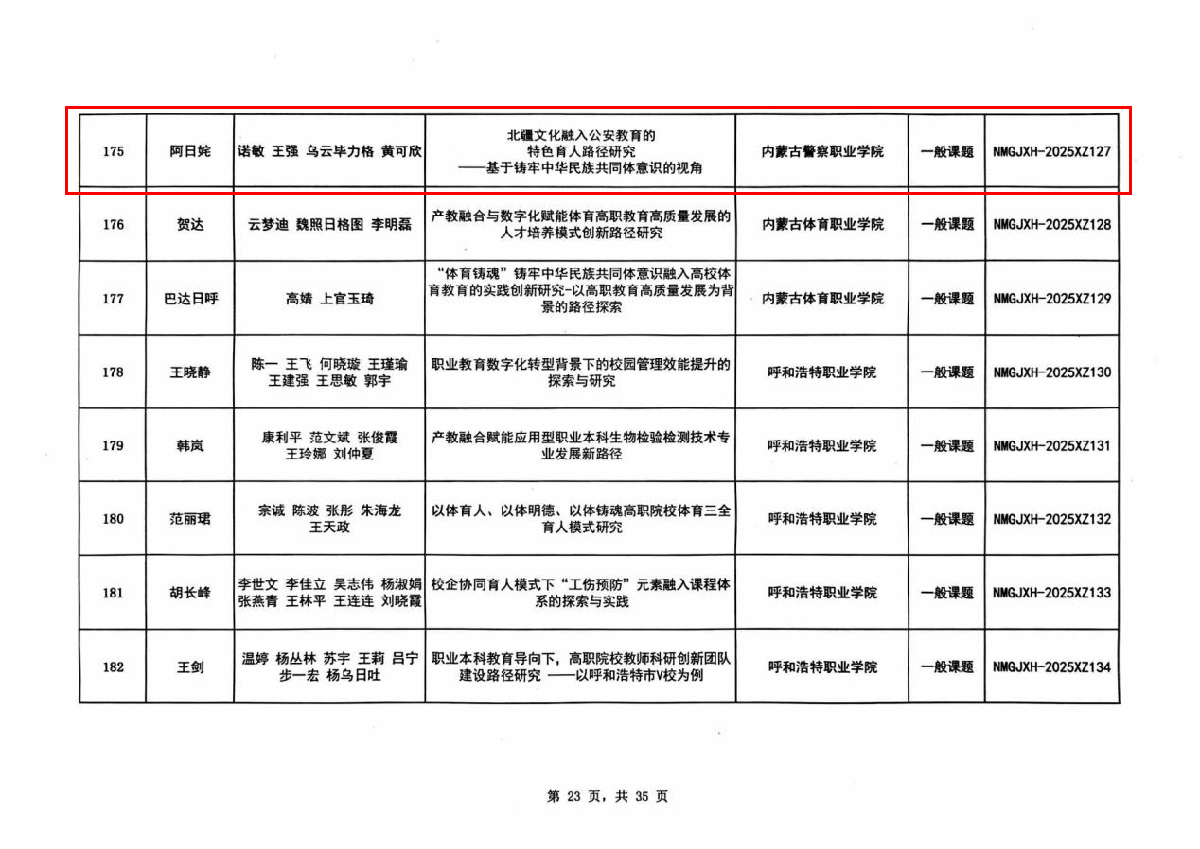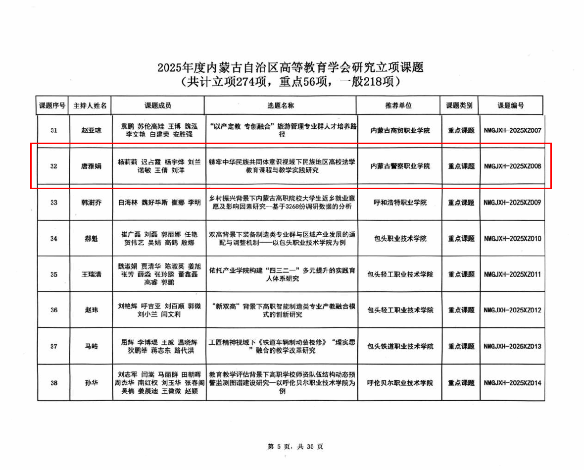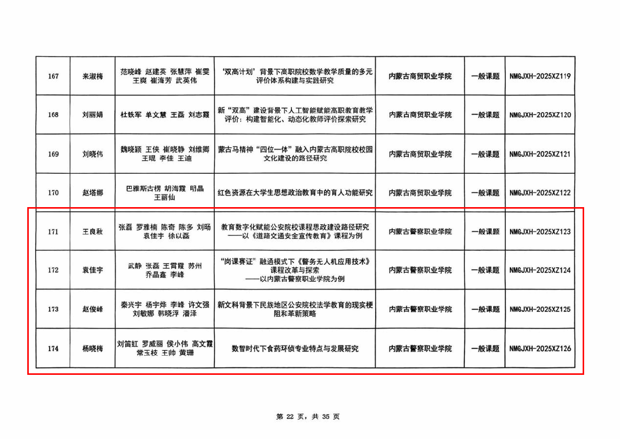 近日,内蒙古自治区高等教育学会发布了《关于公布2025年高等教育研究立项课题的通知》。我院申报的6个项目成功获批立项,法律系唐雅娟副教授主持的《铸牢中华民族共同体意识视域下民族地区高校法学教育课程与教学实践研究》获批重点项目,交通管理系副主任王良秋教授主持的《教育数字化赋能公安院校课程思政建设路径研究——以<道路交通安全宣传教育>课程为例》、交通管理系袁佳宇老师主持的《“岗课赛证”融通模式下<警务无人机应用技术>课程改革与探索——以内蒙古警察职业学院为例》、法律系赵俊峰老师主持的《新文科背景下民族地区公安院校法学教育的现实梗阻和革新策略》、侦查系杨晓梅博士主持的《数智时代下食药环侦专业特点与发展研究》、蒙语授课教学部阿日姹老师主持的《北疆文化融入公安教育的特色育人路径研究——基于铸牢中华民族共同体意识的视角》等5个项目获批一般项目。