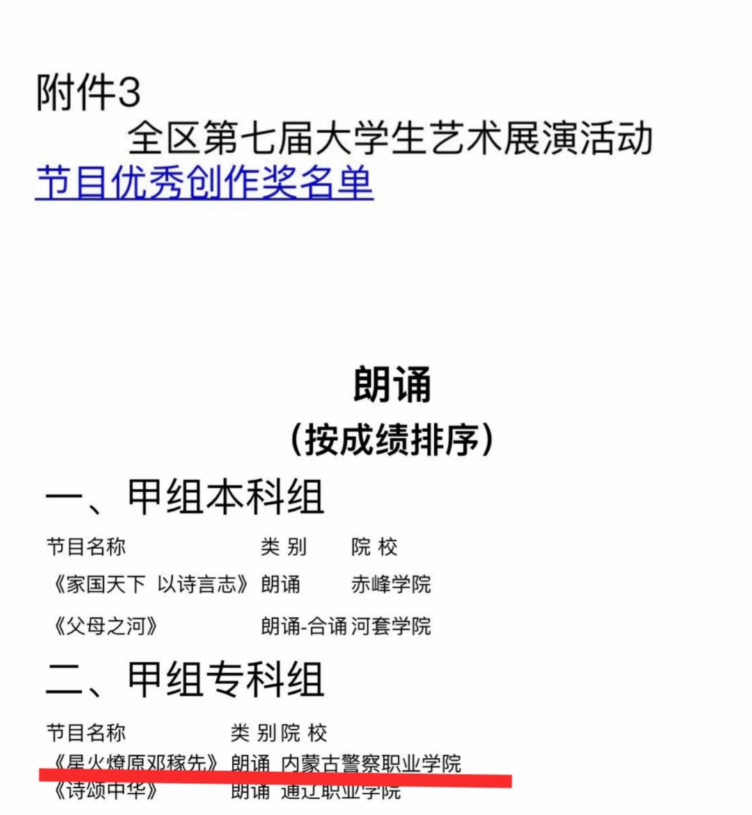 2023年3月—12月自治区教育厅举办“厚植家国情怀,涵养进取品格”为主题的全区第七届大学生艺术展演活动,我院经过校内选拔,选送马成鑫、杨乐同学的朗诵作品《星火燎原——邓稼先》代表我院参加此次活动。经过认真准备、精心排练,朗诵作品《星火燎原——邓稼先》在本次比赛中获得艺术表演类朗诵作品甲组专科一等奖及节目优秀创作奖。