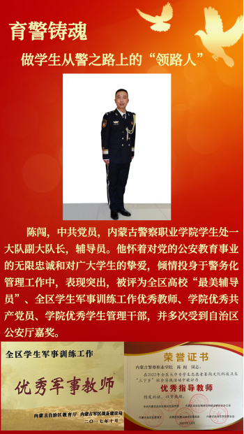 为深入学习贯彻党的二十大精神,大力培养选树新时代高校辅导员先进榜样,自治区教育厅组织了2022年全区“最美高校辅导员”推选展示活动。经过资格审查、专家评审和网络答辩,评选出10名2022年内蒙古自治区“最美高校辅导员”,其中,我院学生处一大队副队长、辅导员陈闯获此殊荣。