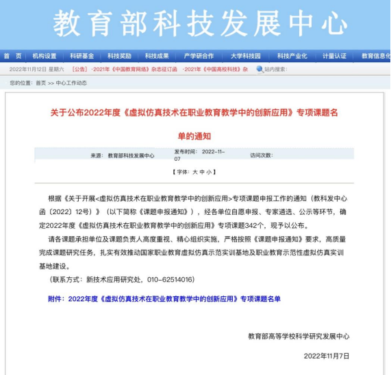 近日,教育部高等学校科学研究发展中心发布了《关于公布2022年度< 虚拟仿真技术在职业教育教学中的创新应用>专项课题名单的通知》,我区共有6个专项课题获批立项。我院网安专业教师张金文主持的《基于虚拟仿真技术的网络安全与执法专业实训教学模式与效果评价研究》在本次专项课题中立项。