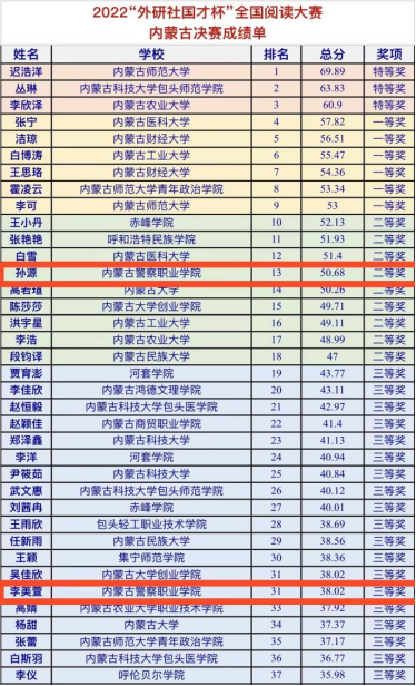 11月5-6日,由外研社、北京外研在线数字科技有限公司和中国外语测评中心主办,中国外语与教育研究中心合办的2022“外研社•国才杯”全国英语演讲、写作、阅读大赛内蒙古赛区决赛隆重举行。我院经过精心选拔,共派出两名选手参加了11月6日举办的阅读大赛,与区内20余所院校、51名选手同台竞争。周奕名老师指导的2022级治安管理一区队孙源同学荣获阅读大赛二等奖,谭昆老师指导的2022级治安管理二区队李美萱同学荣获阅读大赛三等奖。