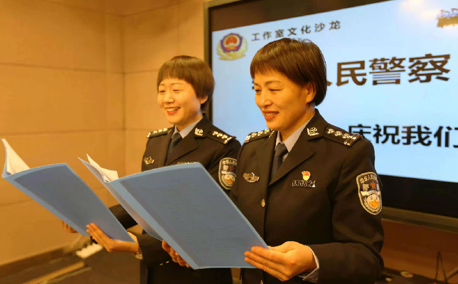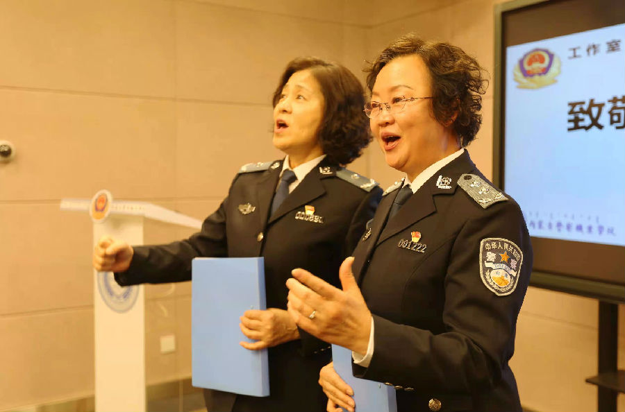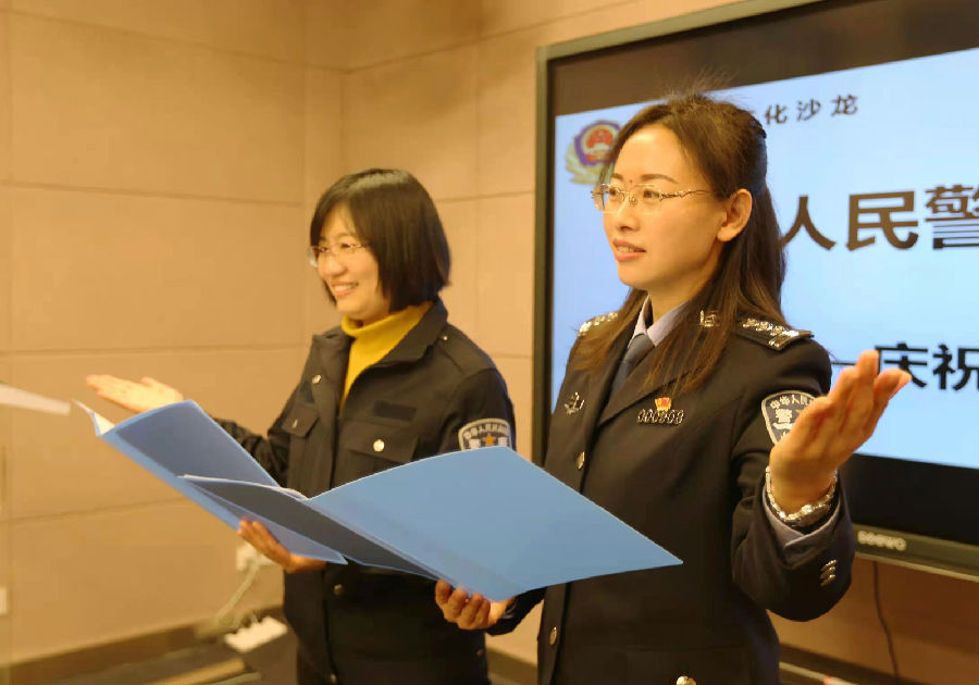 接着,工作室每一位教师都表演了节目。高鹏和唐亚君两位教授的女声二重唱《少年壮志不言愁》、武静和李静静两位老师的诗朗诵《赞美你,人民警察》、赵淑辉和朱广芹两位博士的诗朗诵《最美的你》并致《2022年新年献词》、魏丽红和秦晓慧两位老师的诗朗诵《绝不动摇》、都声情并茂地表达了对人民警察的敬意。