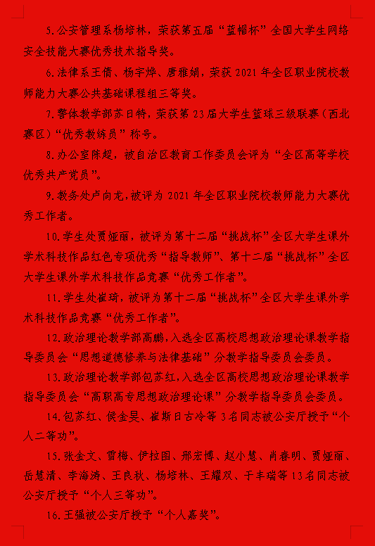 为表彰先进,树立榜样,激励斗志,增强广大教师的责任感、荣誉感和使命感,2021年9月9日下午学院隆重举行庆祝第37个教师节暨表彰大会系列活动。自治区公安厅政治部党委副书记、副主任潘存和,公安厅政治部人事训练处处长邓忠及学院党委班子成员出席会议,党委副书记、院长李永林主持会议,全体教职工、部分退休教师和学生代表参加会议。