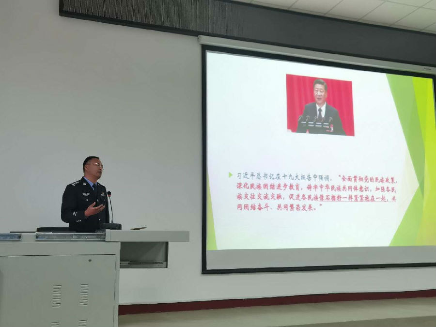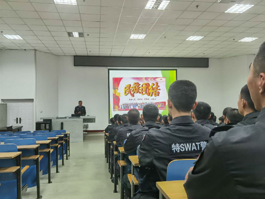 赵军老师指出,我们伟大的祖国,幅员辽阔,文明悠久,一部中国史,就是一部各民族交融汇聚成多元一体中华民族的历史,就是各民族共同缔造、发展、巩固统一的伟大祖国的历史。中国特色社会主义进入新时代,各族人民亲如一家。实现中华民族伟大复兴的中国梦,就要以铸牢中华民族共同体意识为主线,坚持共同团结奋斗、共同繁荣发展,促进各民族像石榴籽一样紧紧拥抱在一起。赵军老师要求,作为新时代公安预备警官,要坚决听从党的领导,高举民族团结大旗,弘扬伟大的爱国主义精神,紧密结合特警所承担的反恐、处突、防爆、维稳等技能要求,努力学习,刻苦训练,不负韶华,着力提升专业水平,争做一名维护各民族平等、团结、进步的特警队员。