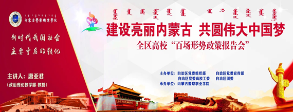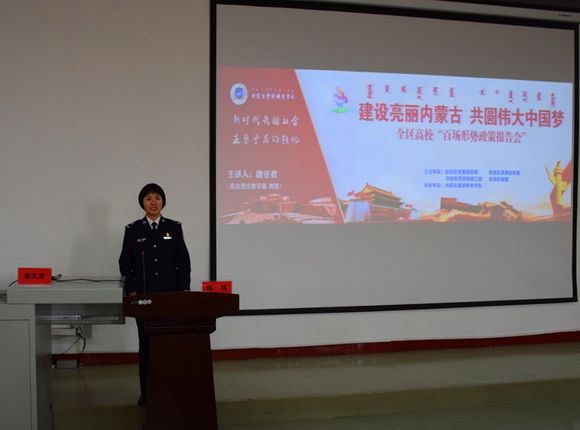 为深入学习宣传贯彻习近平新时代中国特色社会主义思想和党的十九大精神,进一步深化学院“大学习、大提升”活动,根据自治区党委办公厅、自治区人民政府办公厅《关于推进高等院校形势政策报告会制度化常态化的意见》精神,10月31日下午,学院举办了“建设亮丽内蒙古,共圆伟大中国梦”2018年第三场形势政策报告会。我院政治理论教学部唐亚君教授,以“深刻领会新时代我国社会主要矛盾的转化”为题为师生作专题讲座。学院党委委员、政治部主任陈瑛主持并作总结发言,学生处处长包明、政治理论教学部副主任包苏红及师生代表200多人在现场聆听了报告。