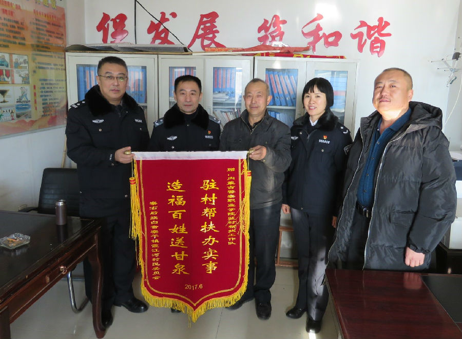 察右后旗副旗长谷巨龙、旗扶贫办主任李彩清、白音察干镇镇长胡日成、镇人大主任巴特尔以及白音察干镇办公室主任兼霞江河村指定帮扶片长吴兰柱、霞江河村村委会书记兼村委会主任董瑞、计生委主任张永忠对学院第二批扶贫工作队两年多的辛勤工作给予高度评价和充分肯定,并向学院第二批驻村扶贫工作队赠送了印有“驻村帮扶办实事,造福百姓送甘泉”的锦旗,以感谢学院驻村扶贫工作队对霞江河村两年多的帮扶工作。