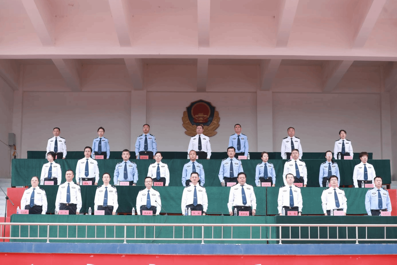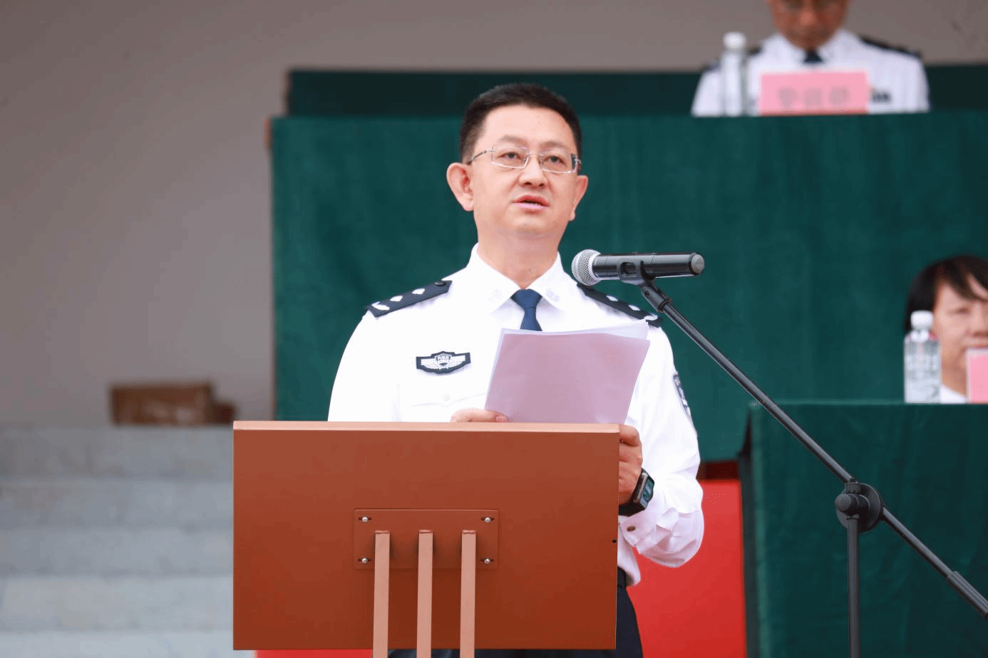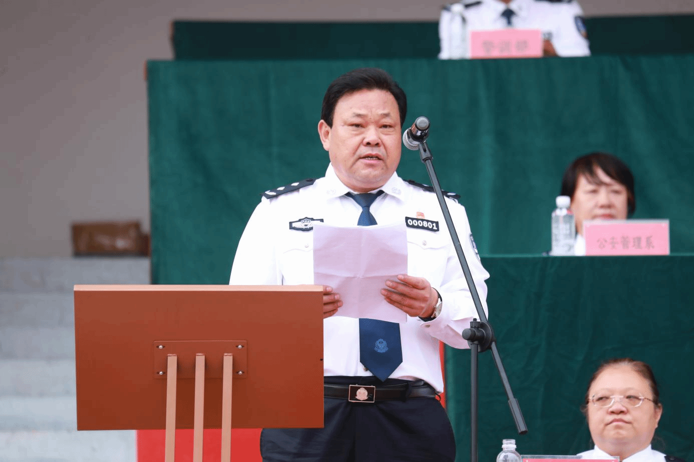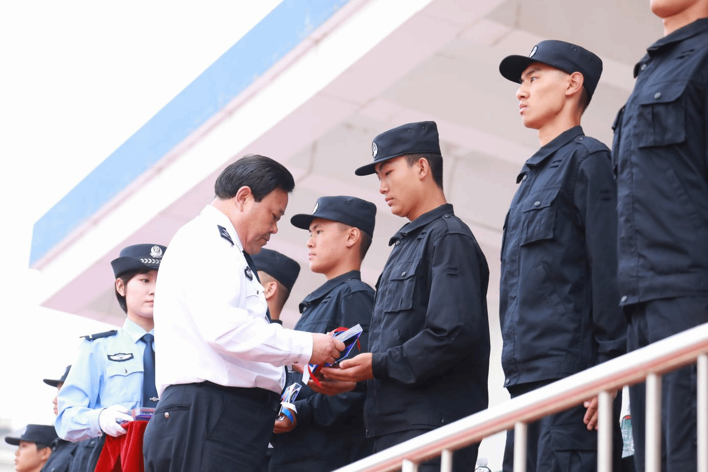 苏和生书记为2023级新生代表颁授学员警衔、学员警号和胸徽,标志着2023级全体新生正式加入共和国预备警官的行列。