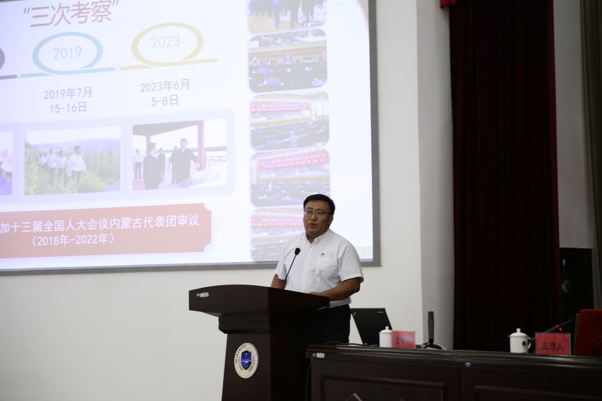 为深入学习贯彻习近平总书记对内蒙古的重要指示批示精神,深切感悟习近平总书记对内蒙古的深情关怀和殷切希望,扎实推动习近平总书记重要讲话精神落实落地,教育引导全院师生切实把思想和行动统一到贯彻落实习近平总书记考察内蒙古时的重要讲话精神上来,9月5日,“永远跟党走 建功新时代”自治区理论学习轻骑兵示范宣讲团第一分队一行6人走进我院进行宣讲。学院青年教师代表、政治理论教学部全体教师和学生代表参加了宣讲会。宣讲会由政治理论教学部副主任赵淑辉主持。