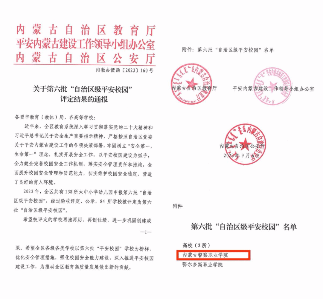 根据《内蒙古自治区开展平安校园建设工作的指导意见(试行)》和《关于组织申报2022年“自治区级平安校园”验收工作的通知》精神,今年4月,我院向自治区教育厅申报了自治区级平安校园,经呼和浩特市平安校园建设工作领导小组推荐,自治区验收评定、公示,我院入选第六批“自治区级平安校园”名单。