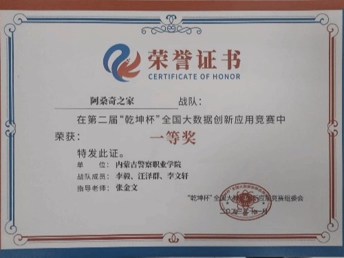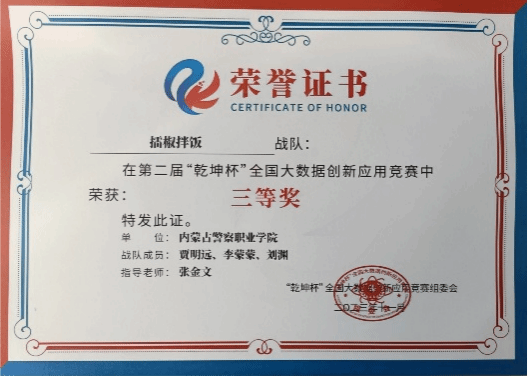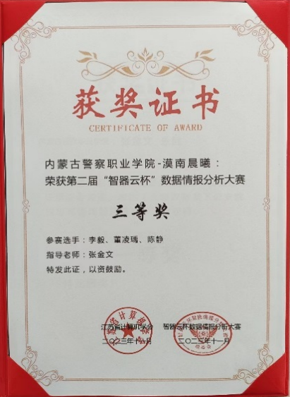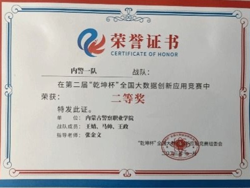在本届“乾坤杯”全国大数据创新应用竞赛中,获得一等奖的学生是2022级侦查专业的李毅、治安专业的汪泽群、特警专业的李文轩;获得二等奖的学生是2023级网安专业的王婧、马帅,侦查专业的王政;获得三等奖的学生是2022级网安专业的王垚、姜嘉宁、赵震、李思进、齐哲,2023级网安专业的贾明远、刘渊、李蒙蒙。在本届“智器云杯”数据情报分析大赛中,获得三等奖的学生是2022级侦查专业李毅、网安专业陈静、董凌瑀。以上两个大赛的指导教师均为学院公安管理系网安专业张金文老师。