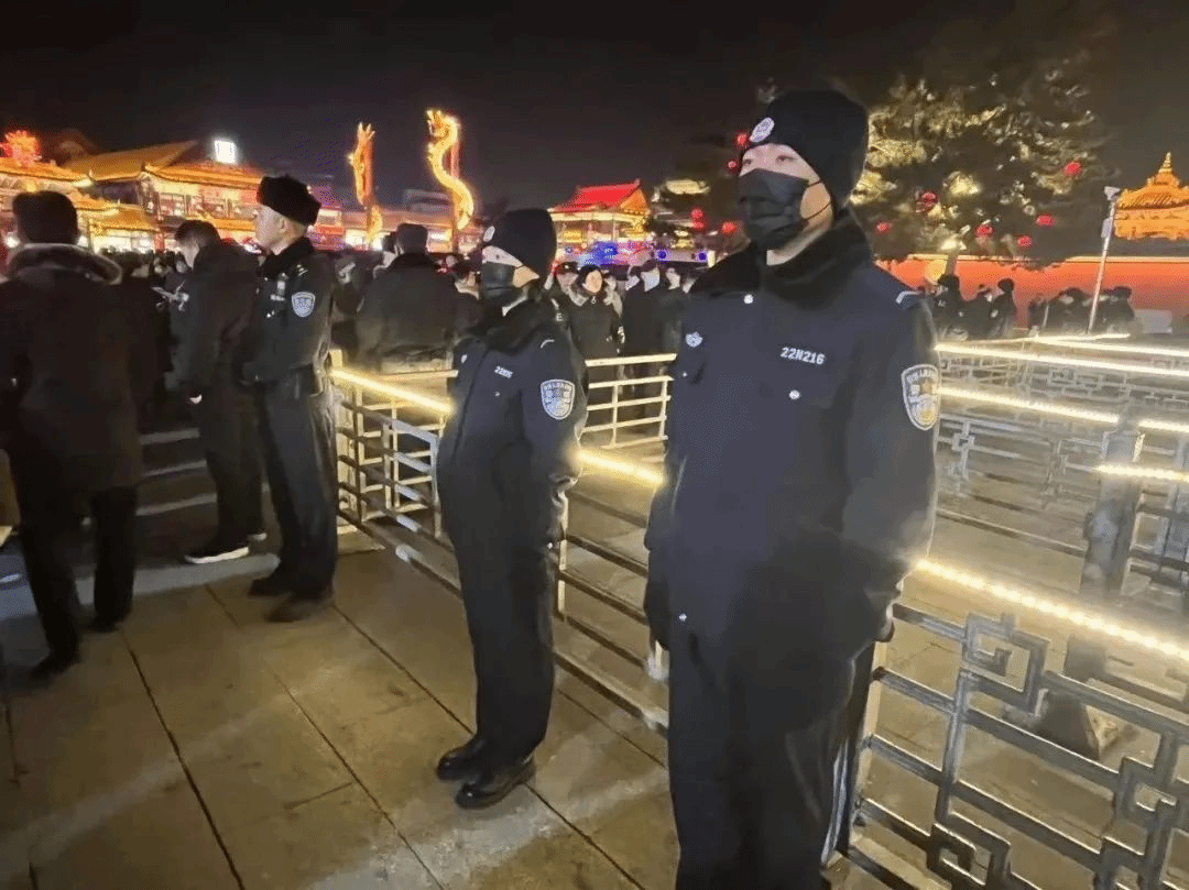 2023年12月31日,学院2000名学警整装待发,分批到达各自岗位开始执勤。工作中,学警们在带队老师和民警的带领指挥下,坚守在一线执勤岗位,所有同学都表现出优良的工作作风,有的学生逆流而上,为防止踩踏喊哑了嗓子;有的学生帮助家长及时找到走失的小孩;有的学生面对群众的困难及时帮助;有的学生值守位点特殊为了群众安全只能背对烟花表演坚持不动;有的学生为群众及时找回丢失的手机;有的学生面对不明事由的群众镜头不卑不亢,耐心解答……