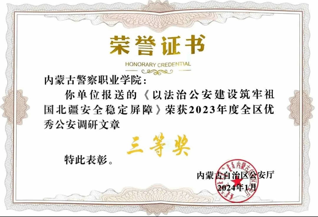 近期,内蒙古自治区公安厅公布2023年度全区公安调研工作优秀调研成果名单,通报表彰优秀调研成果18篇,我院政治理论教学部朱广芹教授的《内蒙古边疆民族地区警务工作融入社区安全治理研究》荣获优秀调研成果二等奖,法律系杨宇烨教授的《以法治公安建设筑牢祖国北疆安全稳定屏障》荣获优秀调研成果三等奖。