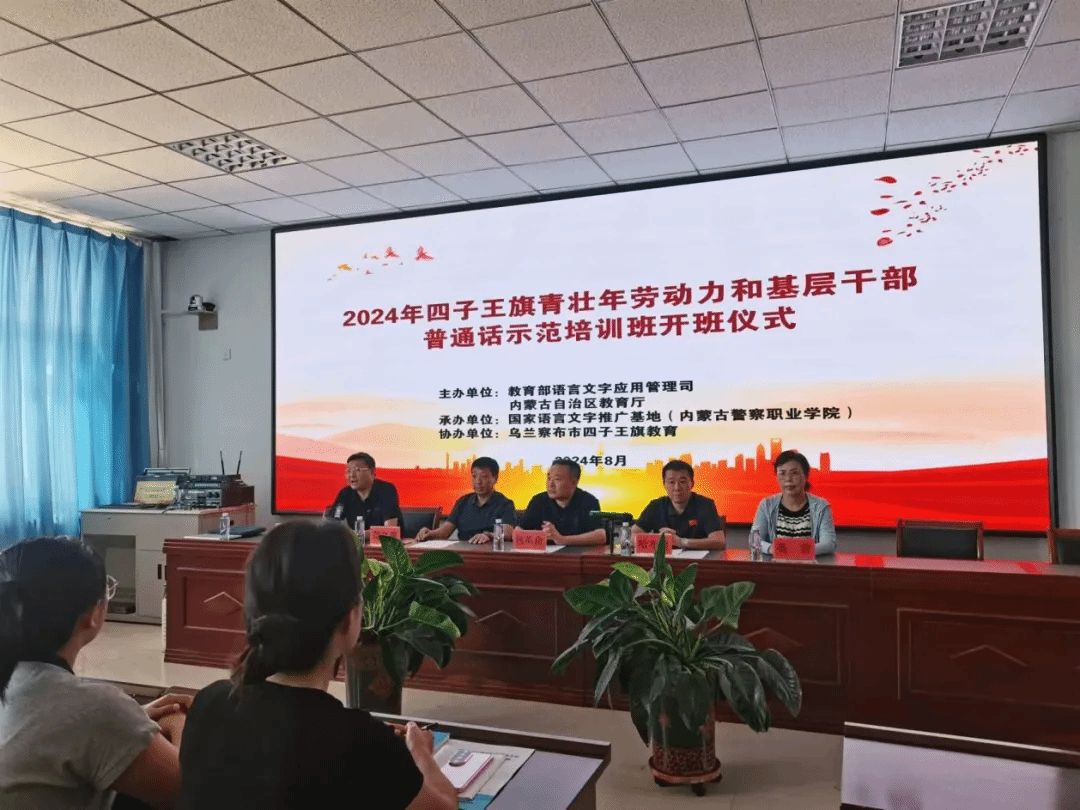为深入学习贯彻落实党的二十大和二十届二中、三中全会精神,着力加强青壮年劳动力和基层干部普通话应用能力,助力乡村振兴,服务铸牢中华民族共同体意识,受教育部委托,由自治区教育厅主办,国家语言文字推广基地(内蒙古警察职业学院)承办“2024年四子王旗青壮年劳动力和基层干部普通话示范培训班”。8月27日上午,在四子王旗举行培训班开班仪式,自治区教育厅语言文字应用管理处处长包革命,四子王旗委常委、宣传部长范之良,四子王旗教育体育局党委书记、局长侯玉根,内蒙古警察职业学院党委委员、副院长哈布日,内蒙古警察职业学院公安管理系教授、本期培训班专家团队负责人英君出席。来自四子王旗100名青壮年劳动力和基层干部参加仪式。开班仪式由教育体育局局长侯玉根主持。