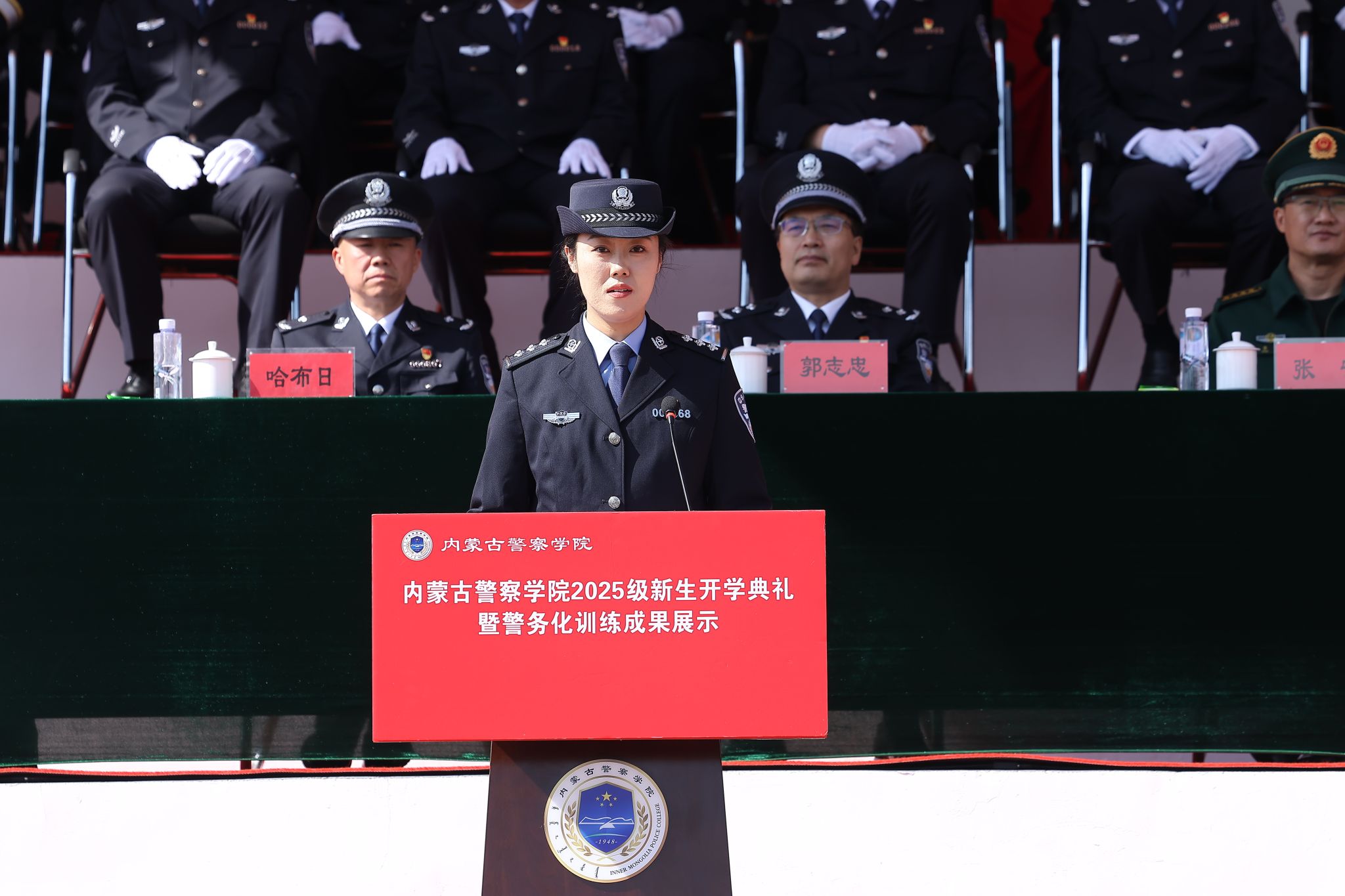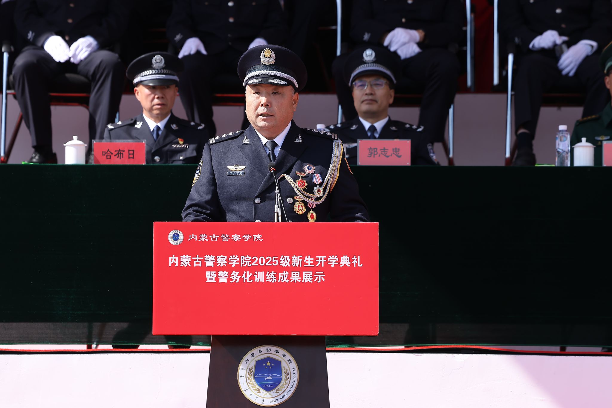 他指出,刚才进行的分列式汇报表演,彰显了新生警务化训练取得的良好成效,高高飘扬的党旗、国旗、警旗庄严神圣,警徽方队、红旗方队、专业方队整齐划一,同学们的精神风貌青春飞扬、英姿勃发。授予2025级新生警衔标志着广大新同学顺利实现了从“普通学生”到“预备警官”的华丽转身。新生进行入警宣誓真正确立维护国家政治安全和社会稳定的凌云壮志,鲜明阐述献身公安、献身警营的信心决心。教师、新生、家长代表的发言,让大家感受到提升层次、升格本科后的内蒙古警察学院,更加具有强大凝聚力、向心力和感召力。向承训部队赠送锦旗,加固的是军警“互教互学、互帮互助、互促互进”的深厚友谊,传递的是公安和部队“共建、共进、共保安全”的共同使命。