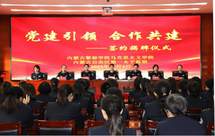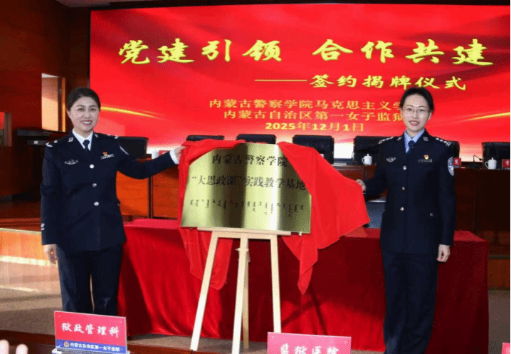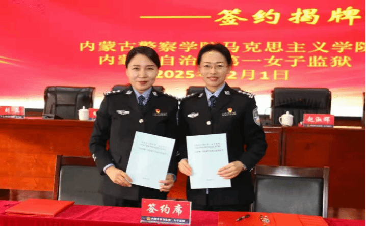 为深入贯彻落实习近平总书记关于学校思政课建设的重要指示精神,紧密围绕学院党委实战化教学改革部署要求,推动思想政治教育与实践育人深度融合,2025年12月1日,我院马克思主义学院与内蒙古自治区第一女子监狱第一党支部共建“大思政课”实践教学基地签约仪式在内蒙古自治区第一女子监狱举行。马克思主义学院负责人赵淑辉,内蒙古自治区第一女子监狱政委张洁、政治部主任邰微微、第一党支部书记张一平出席仪式,马克思主义学院教师代表及内蒙古自治区第一女子监狱干警代表参加仪式。