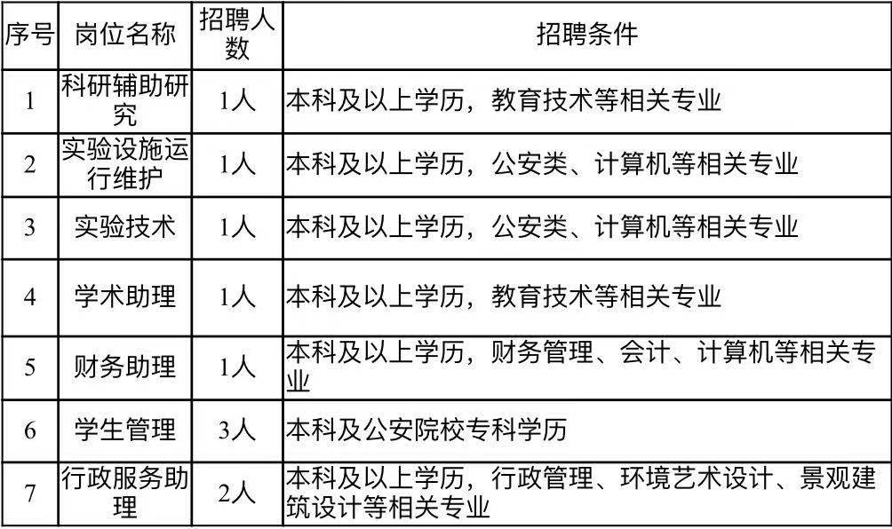 3.科研助理岗位为全日制普通本科、硕士、博士应届毕业生;学生管理和行政服务助理岗位为全日制公安院校专科,全日制普通本科、硕士、博士毕业生。