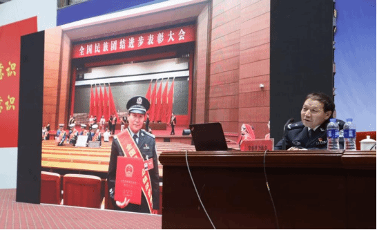 宝音向学生们坦诚分享了自己从警以来的荣誉历程。自1997年参加公安工作至今,他先后荣获“全国优秀人民警察”“全国人民满意的公务员”“全国优秀共产党员”等多项重磅荣誉,而最让他铭记一生的,是三次见到习近平总书记的宝贵经历。2019年10月1日,宝音以“全国人民满意的公务员”和公安英模代表身份,受邀赴京观看新中国成立70周年大阅兵。他回忆,收到请柬时如在梦中,9月30日在人民大会堂参加招待会首次见到习近平总书记,内心振奋;次日阅兵现场的威武方阵与先进装备,更让他为国家70年变迁动容落泪。此后,他又于2021年6月全国“两优一先”表彰大会、2024年9月全国民族团结进步表彰大会上两次见到总书记。“每次都心潮澎湃,这些荣誉是党和国家对基层民警的认可与鞭策。”朴实话语中,满是基层民警对党的忠诚与感恩,深深打动学生。