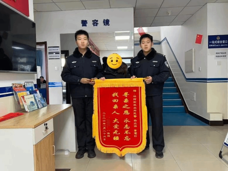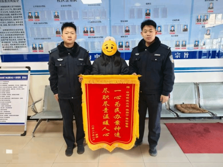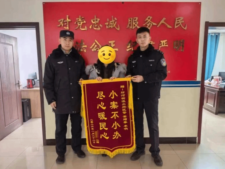 家属为表示感谢,特意制作锦旗送到派出所,对两位实习学警的高效处置和暖心服务给予高度认可。
