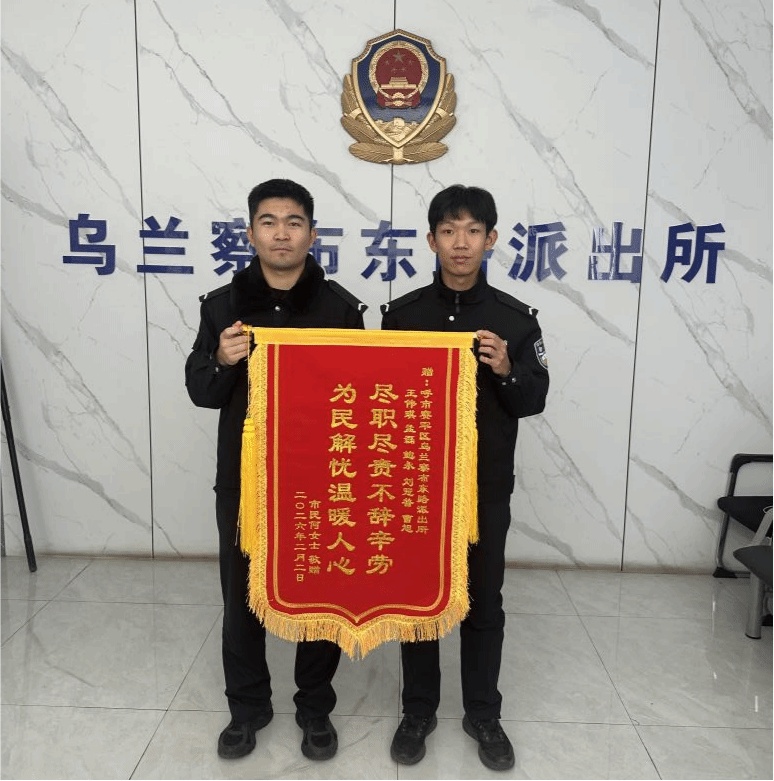 次日,失主专程来到乌兰察布东路派出所,将一面印有赞誉字样的锦旗送到民警及实习学警手中,当面表达诚挚谢意。失主动情表示,本以为遗失物品找回希望渺茫,没想到公安机关如此重视群众的“小事”,快速响应、全力搜寻,全程细致耐心、履职尽责,用实实在在的行动解决了群众急难愁盼,真切感受到了公安队伍的温度与担当。