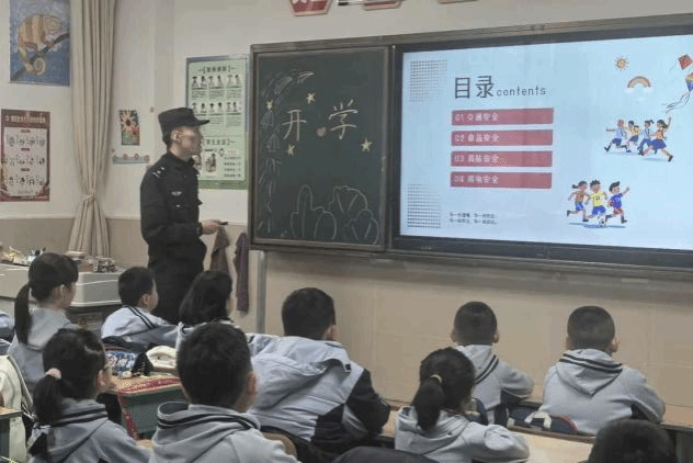 实习学警刘玙跟随民警师父走进呼伦南路小学开展“开学第一课”宣讲活动。宣讲以铸牢中华民族共同体意识教育为主线,以交通安全、校园安全、防拐防骗等内容为核心,通过案例分析、互动问答、情景模拟等形式,引导学生“知危险、会避险”,筑牢校园安全防线。