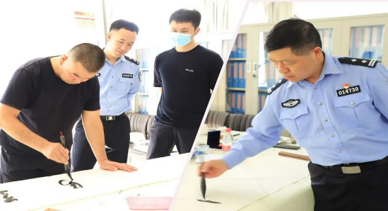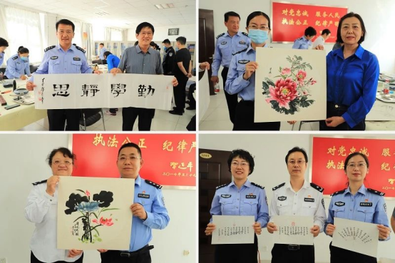 “随风潜入夜,润物细无声”、“博学多思”……书画家们现场挥毫泼墨,把对警营“园丁”的敬爱和关心之情倾注于笔端,用优秀的书画作品向他们致敬。