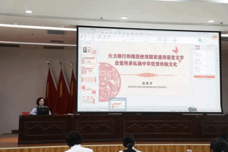 学院主动发挥国家和自治区语言文字两级基地的示范作用。9月11日,国家语委语言文字督导专家、自治区语言文字工作视导员,学院英君教授为自治区民委举办的全区铸牢中华民族共同体意识教育实践基地工作人员培训班和民委机关干部做了《推广普及国家通用语言文字,铸牢中华民族共同体意识》专题讲座。9月20日,内蒙古自治区政协成功举办庆祝中华人民共和国和人民政协成立75周年文艺汇演活动,英君教授诗朗诵《那是我的祖国》,展示了普通话语言艺术的魅力。