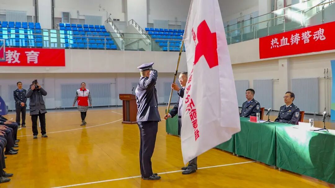 活动中,自治区红十字会党组成员、秘书长刘建忠为内蒙古警察学院无偿献血志愿服务分队授旗。学院无偿献血志愿服务分队志愿者代表24级侦查五区队张轩宇郑重接过队旗,志愿者代表25级侦查三区队胡思宇作表态发言:“这面旗帜,是荣誉,更是使命。它承载着‘人道、博爱、奉献’的志愿精神,更凝聚着我们警校学子‘服务人民’的铮铮誓言。接过这面旗帜,我们就成为连接爱心与生命的桥梁,成为无偿献血公益事业中一支青春有为的藏蓝力量。作为未来的人民警察,守护生命、服务人民是我们的天职。参与无偿献血志愿服务,不仅是一次公益行动,更是我们践行从警誓言、扛起社会责任、奉献青春热血的生动实践。”